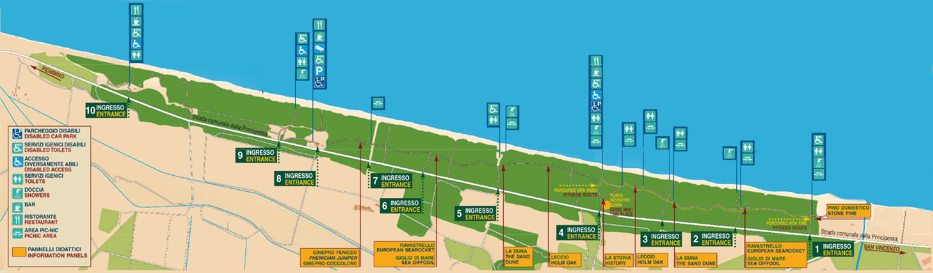 Dall’abitato di San Vincenzo, basta percorrere in direzione sud la Strada della Principessa che corre parallela al mare fra San Vincenzo e Populonia.